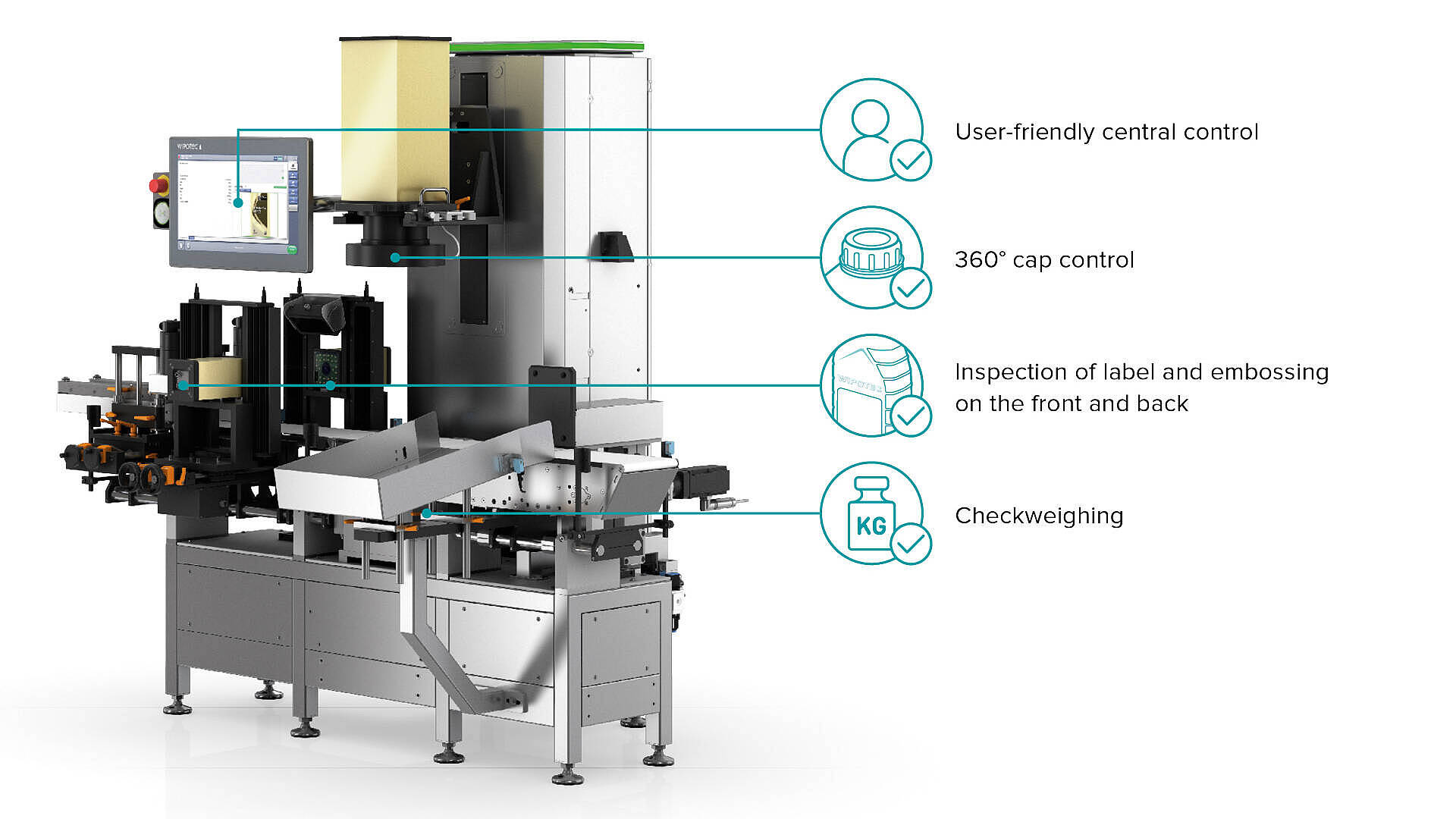 High-precision cameras provide the software with all the information it needs to evaluate presence, color, position, angle and shape, and even to check content such as codes or human readable text. Depending on the camera position, it inspects, for example, the area of the cap and sealing ring, the embossing or the label.