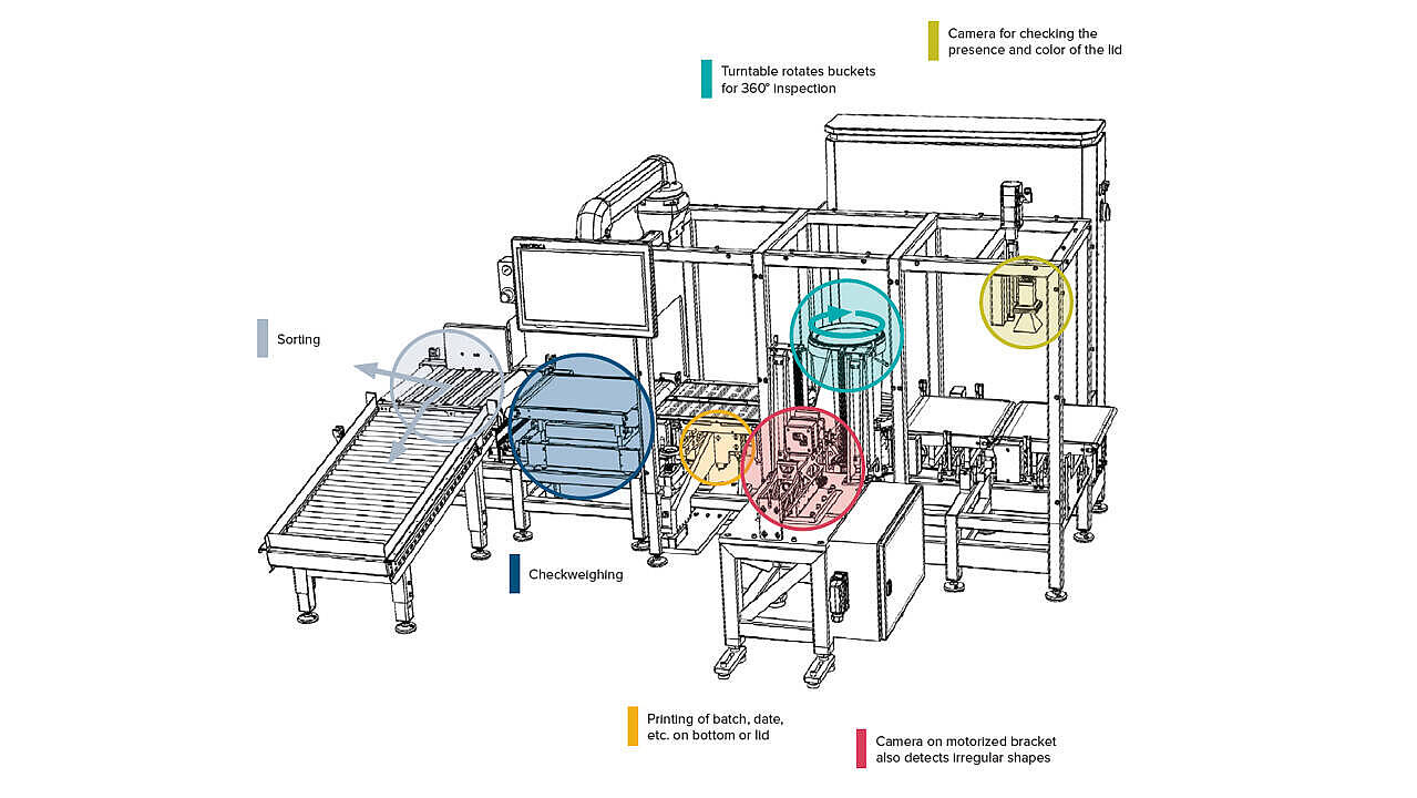 The system first checks whether the lid is present and correct. The turntable then rotates each bucket for a complete 360° inspection. Advanced machine learning algorithms intelligently detect issues such as spills, smudges, or paint splashes, ensuring that no soiled bucket leaves the production line. Batch or product data are printed inline on the bottom or lid and immediately verified by the camera. The integrated checkweigher then ensures that each container meets the specified weight. Finally, defective units are ejected – fully automatically and with smooth integration into existing production processes.